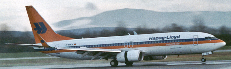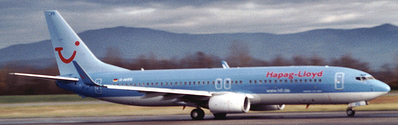 Die Boeing B737-8K5 D-AHFW der deutschen Hapag-Llyod am 11. Dezember 2002 auf dem EuroAirport.