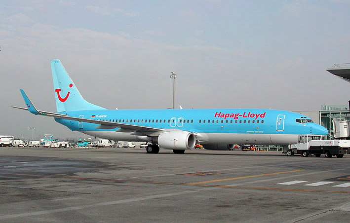 Hapag Lloyd ist am EAP stark präsent mit ihren Boeing B737, hier die B737-8K5 D-AHFE mit blauen -TUI-Farben ...
